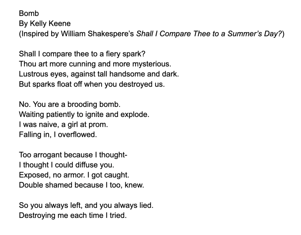 Bomb September 8, 2022 / Kelly Keene by Kelly Keene Share this: Click to share on X (Opens in new window) X Click to share on Facebook (Opens in new window) Facebook Like Loading... Related